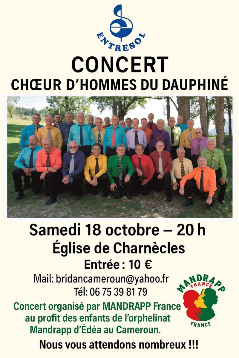Nous vous attendons nombreux au concert d'Entresol, Chœur d'Hommes du Dauphiné, au profit des enfants de l'orphelinat Mandrapp d'Edéa, au Cameroun.