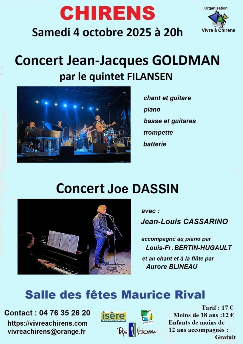 Venez assister à une soirée dédiée à deux icônes de la chanson française, Jean-Jacques Goldman et Joe Dassin ! Les chansons de Jean-Jacques Goldman seront reprises par le quintet "Filansen" et celles de Joe Dassin par le trio "Cassarino".