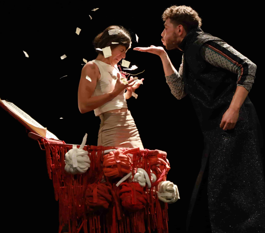 Deux personnages, chacun porte un caddie de supermarché, des caddies qui deviendront bientôt complices de leurs acrobaties. Avec humour et magie, ils entraînent le public à la limite entre deux mondes.