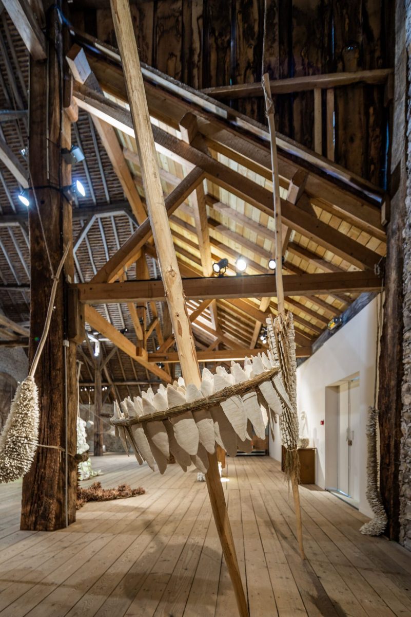 Les sculptures sont posées, comme échouées sur le plancher de la grange, ou suspendues à la charpente. Ces formes animales, anthropomorphes ou encore fossiles, ont un rapport avec l’eau dont la présence est partout suggérée.