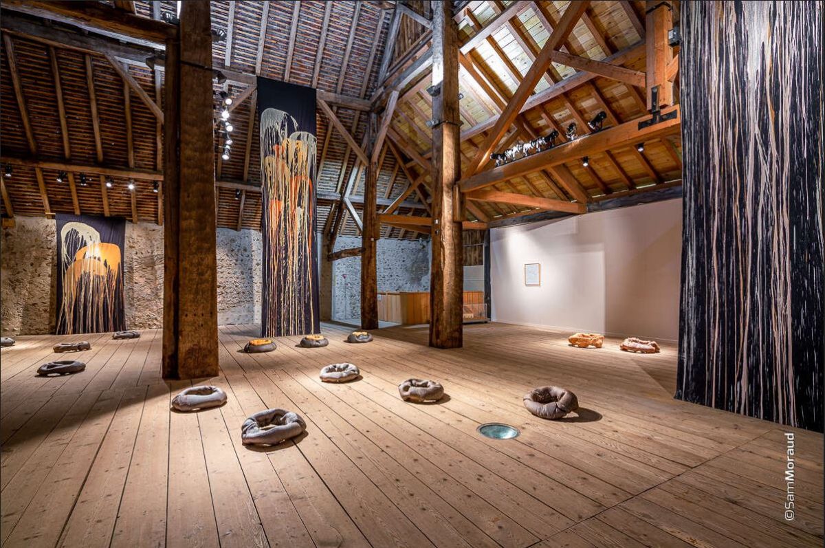 Dans cette installation monumentale le regard est dans un premier temps attiré par ses dessins graphiques et verticaux. Ici la maîtrise du geste et du matériau est évidente et donne naissance à ces coulures de terres colorées qui nourrissent notre imaginaire. Ces tentures accompagnent notre regard jusqu’au sol où la fluidité du mouvement perdure sur les lames du plancher séculaire. La terre a changé d’état. Transformée par le feu, elle laisse place aux Passeuses… Celles qui facilitent le passage.